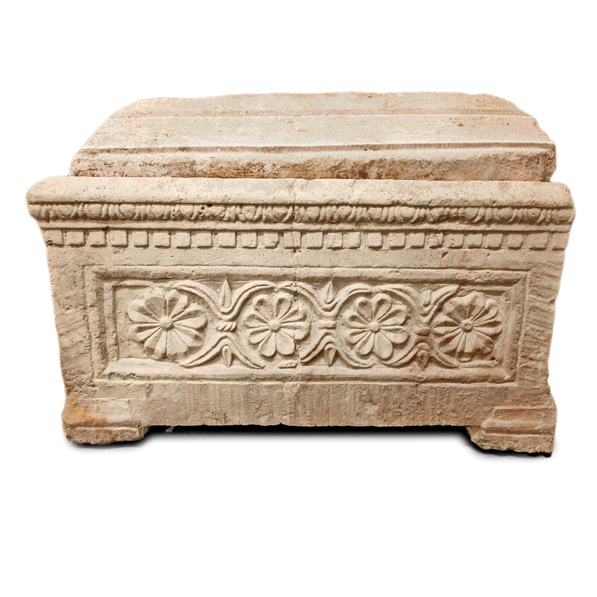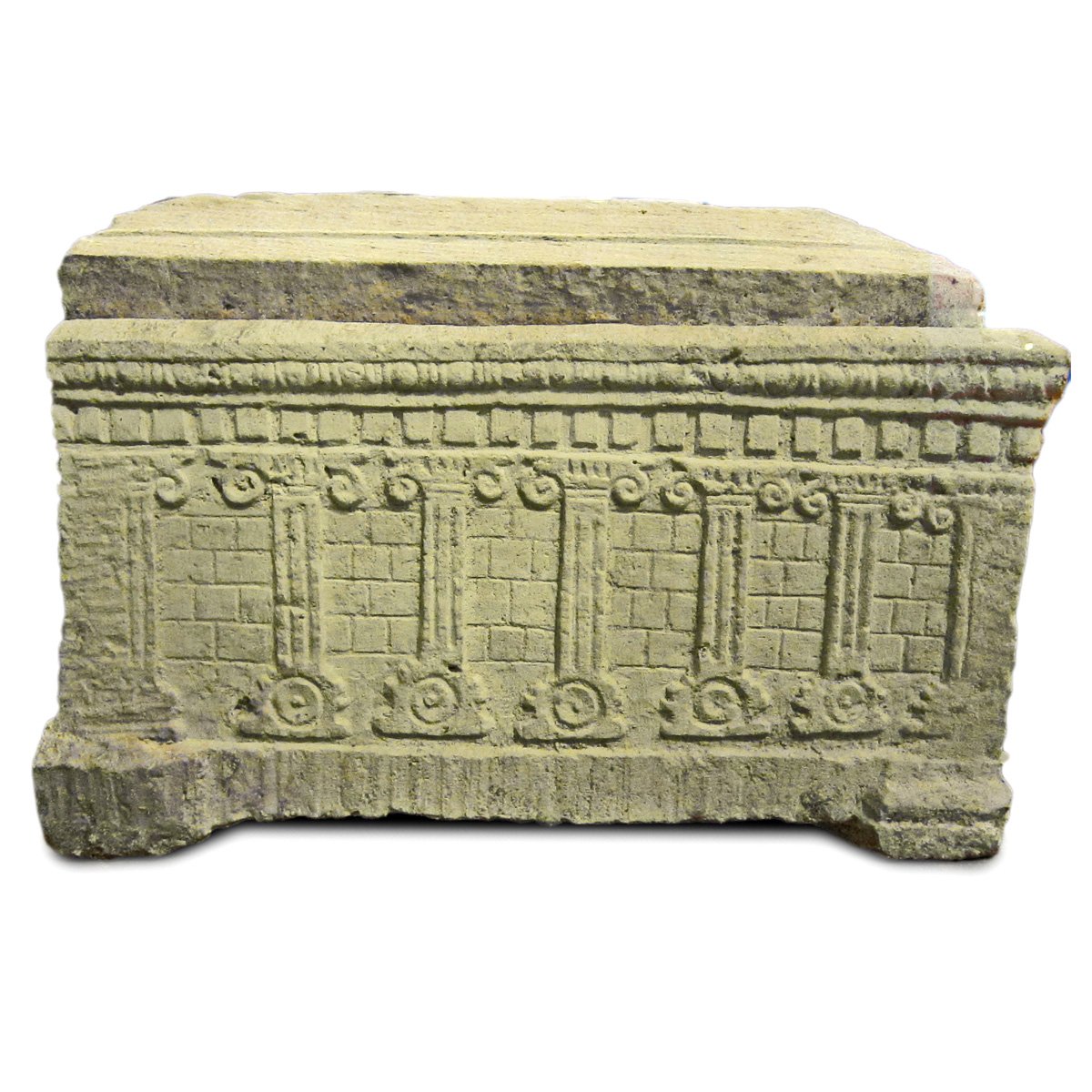 A small limestone ossuary decorated with 7 columns and ashlars on one side and 2 rosettes on the other side. First century AD