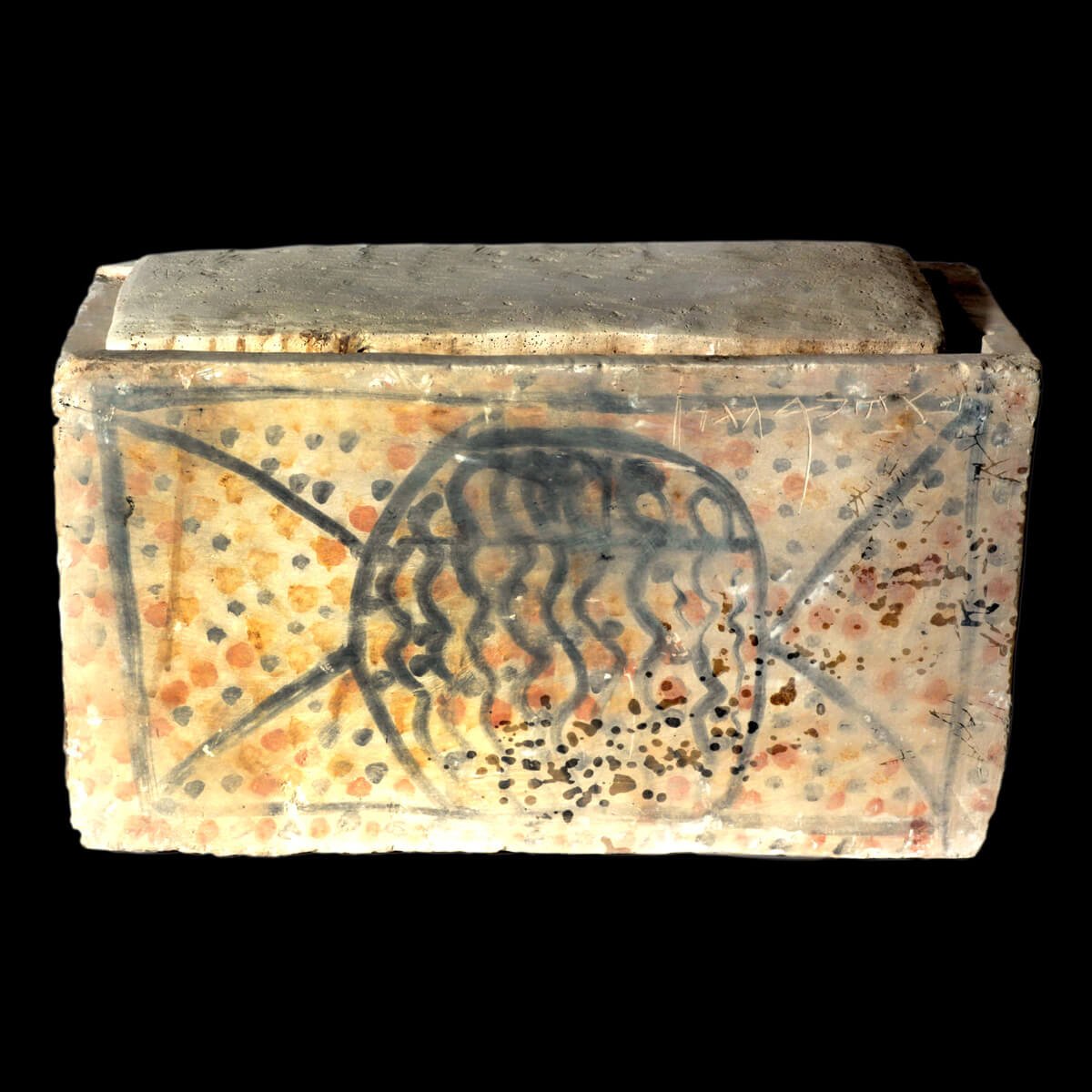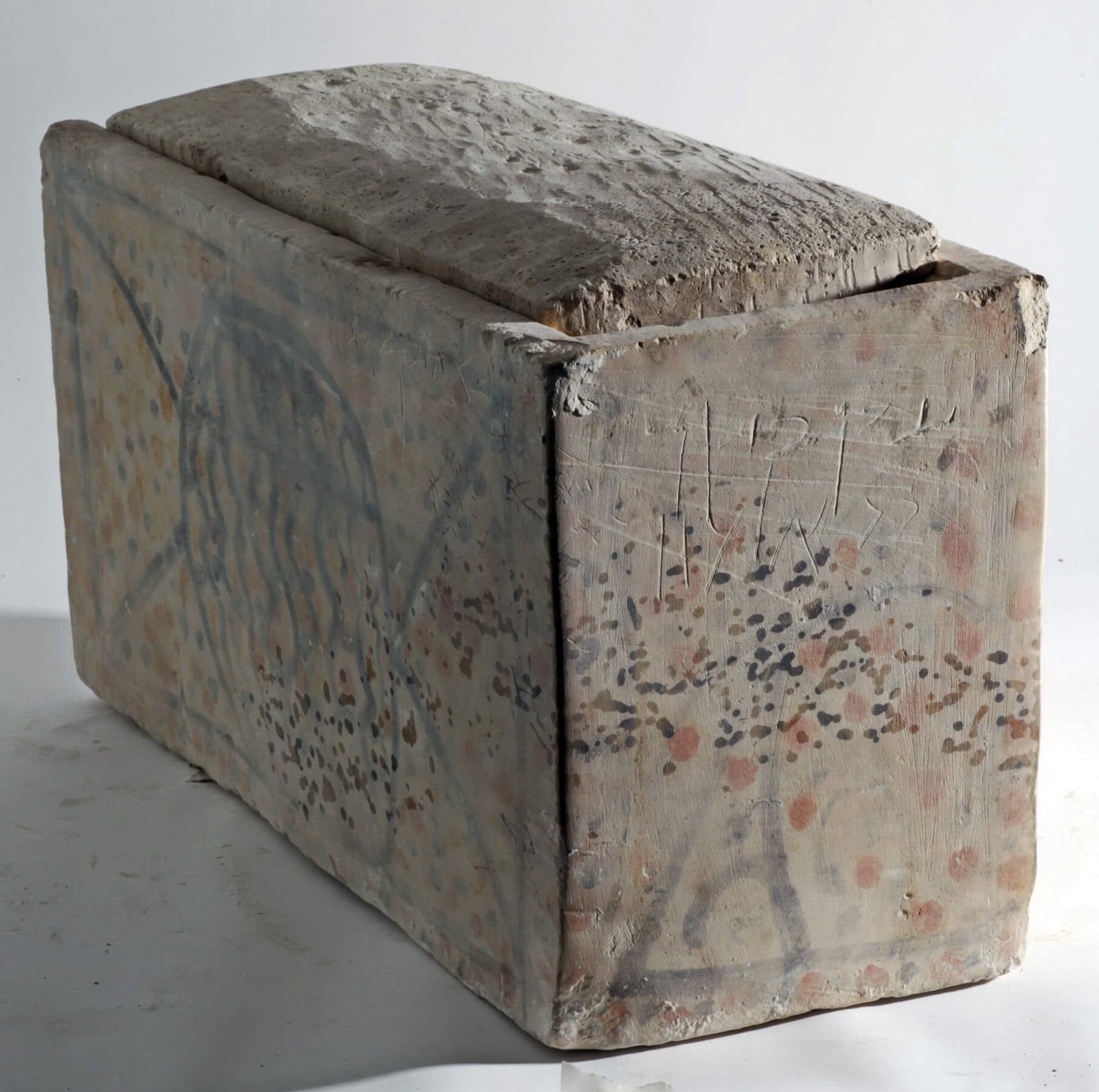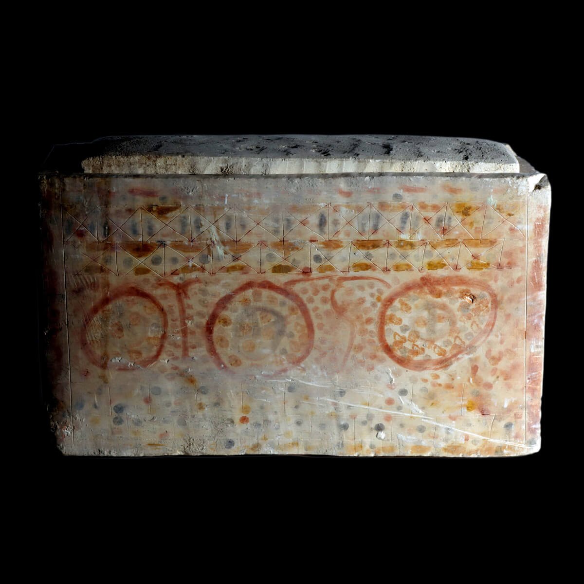 An ossuary decorated in color on all its sides, bearing the inscriptions: 'Jacob son of Elazar' and 'Abba Yehosef the proselyte.' First century CE.