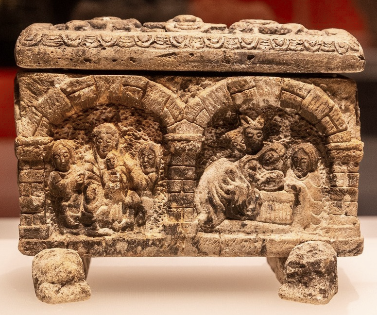 Stone reliquary – a casket in which a relic of a Christian saint was kept, decorated with scenes from the New Testament: Joseph and Mary, the Annunciation encounter between Zechariah the priest (father of John the Baptist) and the angel Gabriel, the birth of Jesus in a manger in Bethlehem, the three Magi bearing gifts, Joseph, Mary, and the midwife in Bethlehem, and more. 4th century CE.